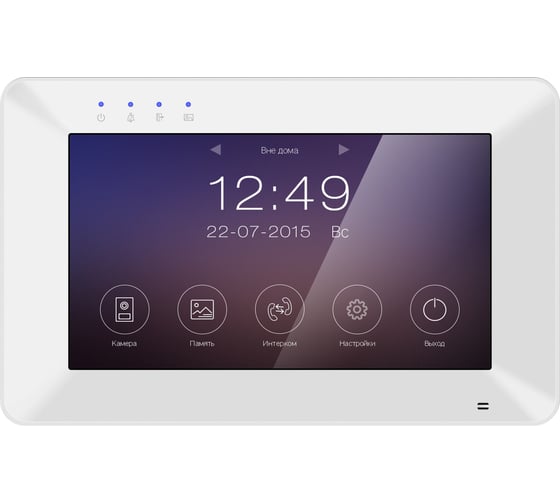 Монитор цветного видеодомофона 7″ резистивный сенсорный экран, разрешение 800×480, hands free, с функцией Wi-Fi (может работать в беспроводных или проводных сетях Ethernet), подключение 2-х вызывных панелей с возможностью связи вызывных панелей с приложением «vhOme» для iOS и Android. Подключение 2х видеокамер, до 4х мониторов в параллель. Встроенная память на 100 фото. Запись фото или видеона microSD карту до 32 ГБ (в комплект не входит). Запись по детектору движения, по одному каналу. Питание 220 в, габариты: 205×128×19мм.